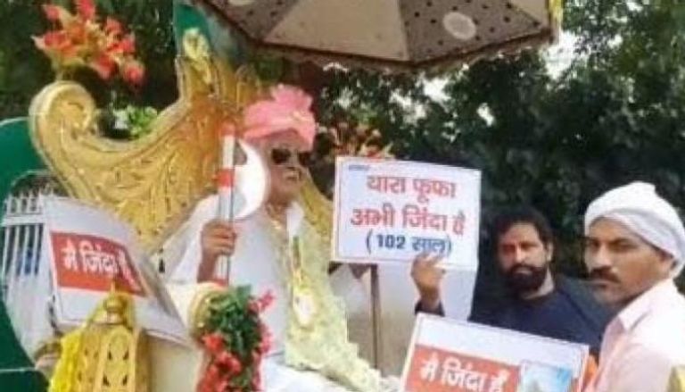 ولجأ العجوز الهندي إلى هذه الحيلة لكي يثبت للسلطات الهندية التي توقفت عن دفع معاش تقاعدي له أنّه لا يزال حياً رغم بلوغه عامه الثاني بعد المائة.