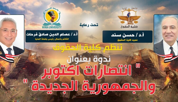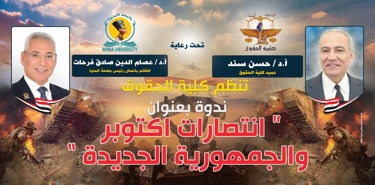 فى إطار احتفالات جمهورية مصر العربية بالعيد الـ٤٩ لانتصار السادس من أكتوبر العظيم احتضنت كلية الحقوق جامعة المنيا، تحت رعاية الأستاذ الدكتور عصام الدين صادق فرحات، القائم بأعمال رئيس جامعة المنيا، والسيد الأستاذ الدكتور حسن سند، عميد كلية الحقوق، عددا من أبطال محافظة المنيا المشاركين فى حرب أكتوبر المجيدة يتقدمهم السيد اللواء عماد الدين ربيع أحمد أحد أبطال قواتنا المسلحة فى احتفالية نظمتها كلية الحقوق بمناسبة احتفالات جمهورية مصر العربية بانتصارات أكتوبر المجيدة.