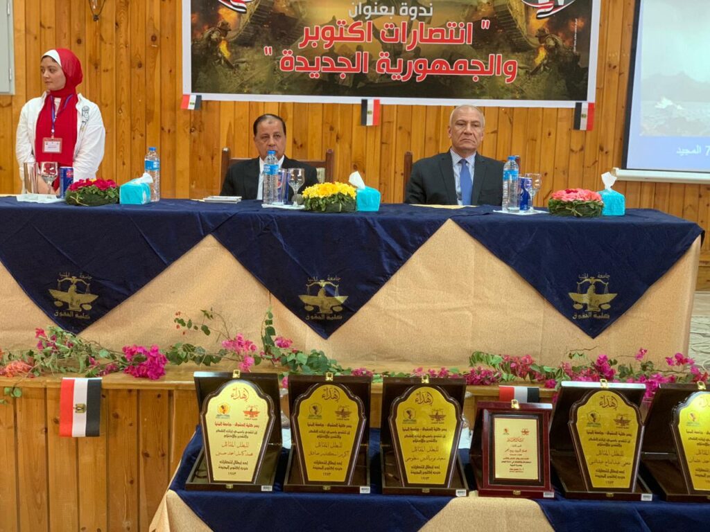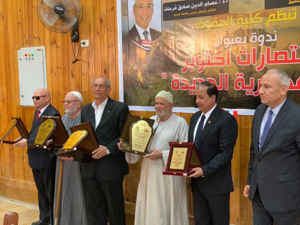 وشهد الحفل تكريم السيد الأستاذ الدكتور حسن سند، عميد كلية الحقوق جامعة المنيا، والسيد اللواء عماد الدين ربيع أحمد بعضا من أبطال أكتوبر المجيد من أبناء محافظة المنيا وتقديم درع كلية الحقوق جامعة المنيا تقديرا لهم وهم: