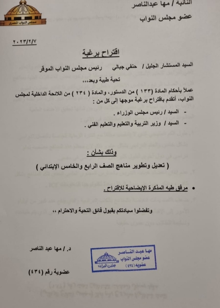 تقدمت النائبة الدكتور / مها عبد الناصر ، عضو مجلس النواب عن الحزب المصري الديمُقراطي بطلب إقتراح برغبة موجه إلى كل من السيد / رئيس مجلس الوزراء ، السيد / وزير التربية والتعليم والتعليم الفني وذلك بشأن تعديل وتطوير مناهج الصف الرابع والخامس الإبتدائي .