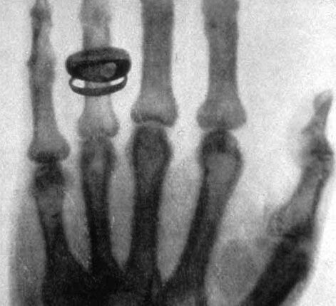 قام وليام رونتجن، مكتشف الأشعة السينية، بتسليط شعاع إلكتروني داخل أنبوب زجاجي مطبق بين طرفيه توتر كهربائي مرتفع. كان هذا الأنبوب مفرغ من الهواء وتنطلق بداخله إلكترونات من قطب كهربائي سالب إلى قطب كهربائي موجب. أُحيط هذا الإنبوب بورق ذو لون فاتح لحماية المستخدم من المجال الكهرمغناطيسي المنبعث ووُضعت شاشة فسفورية في نهايته. عندما اصطدم الشعاع الإلكتروني بالشاشة بدأت بالتوهج. عندما وضع ريتشارد رونتجن يده بالصدفة بين الأنبوب والشاشة الفسفورية، شاهد صورة لعظام يده على الشاشة، وكانت هذه أول عملية تصوير بالأشعة السينية.