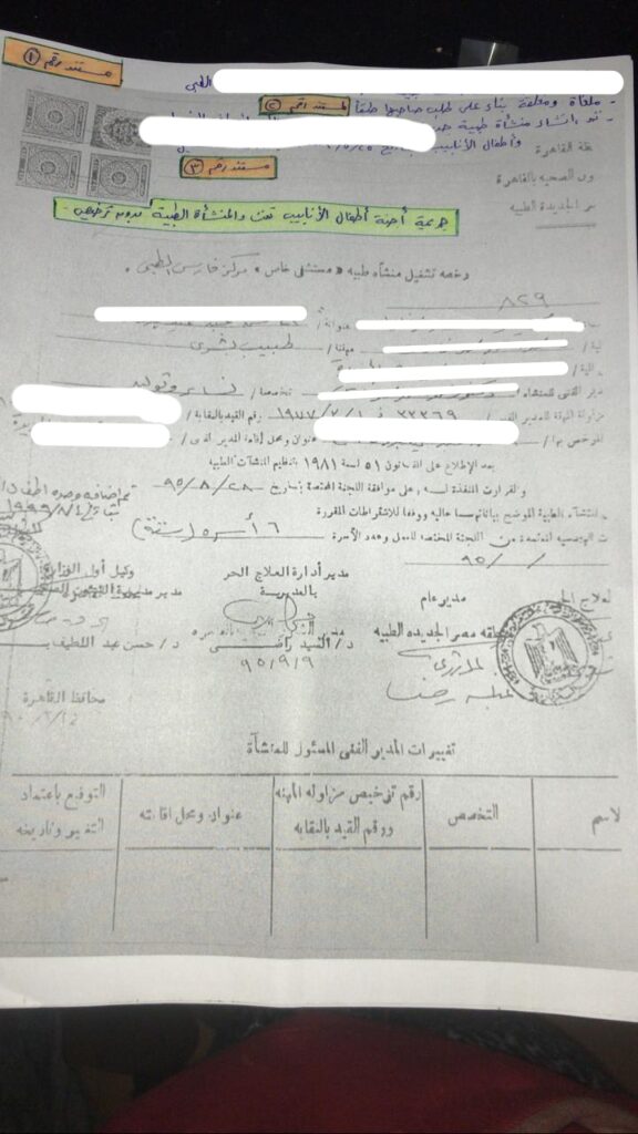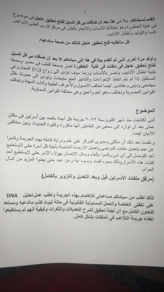 ومؤكداً مطالبته قانونياً بهذا الطفل في حال إن اثبت مطابقة التحليل له، ومن جانبه، أكد الدكتور ج. ج، استشاري تخدير بالمركز، أن هذه العمليات تدار منذ سنوات في المركز بمنطقة النزهة الجديدة بمصر الجديدة، ويتم سرقة الأجنة وزراعتها لأسر أخري، ذلك غير أن مركز “م. ف. ا” غير مرخص ويمارس نشاطه بدون ترخيص منذ ١٥ عاماً وتحديداً منذ عام ٢٠٠٩، وهو عبارة عن “شقة منزلية” لا يوجد بها حتي أطباء متخصصين في وحدة أطفال الأنابيب لإجراء مثل هذه النوعية من العمليات، ومالك المركز والمسئول عنه الآن هي “د.م.ف” نجلة صاحب المركز، وزوجها “م.ص.أ”، ومجموعة من الحاصلين علي شهادات امتياز وتراخيص مزاولة مهنة مشكوك في أمرهم وعلي رأسهم مالكة المركز، وجميع تلك الشهادات حاصلين عليها من الخارج، وهذا الأمر تم الإبلاغ عنه وقيد تحقيق بالنيابة الإدارية صحة أول برقم قضائى ٢٠٢٣/٢٥٦ بتاريخ ٢٠٢٣/٢/٤.