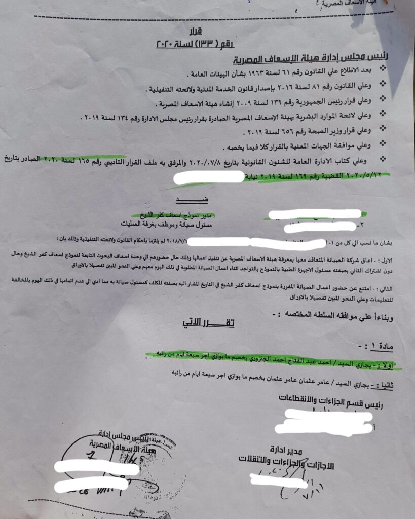 وجاء الحكم عليهما حسب ما ان ذكره في المستندات الرسمية، إنه بعد على موافقه السلطة المختصة قررا رئيس قسم الجزاءات والانقطاعات، ورئيس مجلس إدارة هيئة الاسعاف المصرية مدير ادارة الاجازات والجزاءات والتنقلات التالي: مجاراة “أ.ع” بخصم ما يوازي أجر سبعة أيام من راتبه، وكذلك مجازاة “ع.ع”، بخصم ما يوازي أجر سبعة أيام من راتبه.وفي هذا السياق، قال “أ.ي”، مسعف بهيئة الإسعاف فرع محافظة كفر الشيخ، أن الفساد في هيئة إسعاف محافظة كفر الشيخ ليس وليد اللحظة بل إنه موجود منذ سنوات ، والمتسبب فيها بعض مشرفي الهيئة، وحتي المدير المسئول”أ.ع” يملك صحيفة جنائية غير مشرفة بالمرة، والملف الخاص به يحتوي علي أحكام في قضايا ومخالفات وجزاءات، متسائلاً: كيف تم تعيينه مديراً لهيئة الإسعاف وهو متهم في قضايا ومخالفات ووقع عليه جزاءات، ولماذا مازال هولاء الفاسدين في أعمالهن مناصبهم حتي الآن، وهم قيادات غير مشرفة، ويكتفوا فقط بايقافهم شهر أو ثلاثة عن العمل.
