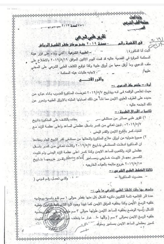 أولاً ملخص ملف الدعوي حيث تخلص الواقعه في انه وبتاريخ ۲۰۱۹/٥/٧ تعرضت المذكورة للضرب باداة عبارة عن حديدة على الطرف العلوي الأيمن مما نشأ عن ذلك اصابتها المثبته بالأوراق الطبيه وتحرر عن ذلك الجنحه عاليه، ثانيا : الأوراق الطبية وهي تقرير طبي صادر من مستشفى كفر الشيخ العام ومفاده بالكشف على المذكورة بتاريخ ٢٠١٩/٥/٧ تبين ان المجني عليها تعاني من كسر باسفل عظمتى الساعد واعلى عظمة الزند مع اشتباء كسر بالكوع الايمن والقدم اليمني، ثالثاً: صورة ضوئية من اوراق علاج المذكورة واشعاتها من مستشفى كفر الشيخ العام ومفادها ان المذكورة ادخلت المستشفي بتاريخ ۲۰۱۹/٥/٧ وكانت تعاني من كسر باسفل عظمتى الزند والكعبره للساعد الايمن وكذا كسر اعلى عظمة الزند اليمني وتم تثبيت الكسور بجهاز تثبيت خارجي ومسامير Nancy mail وتقرر خروجها بتاريخ ٥/١٥/۲۰۱۹ خروج متابعه بالعيادة الخارجية.