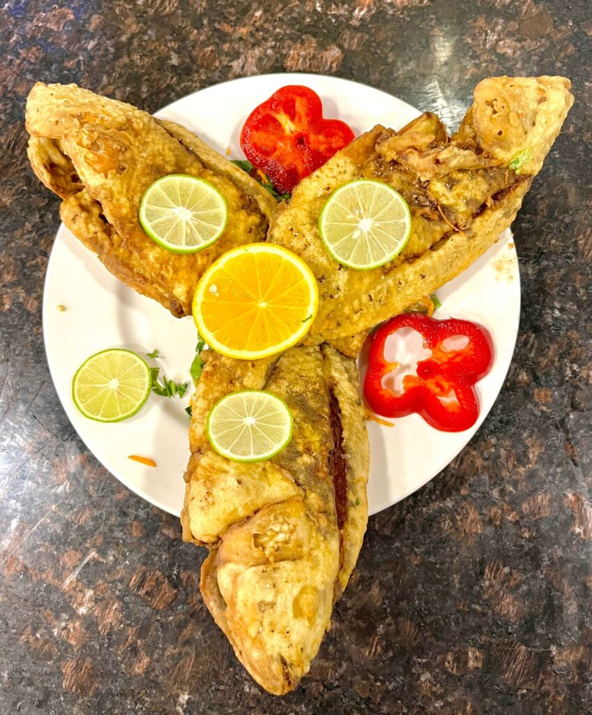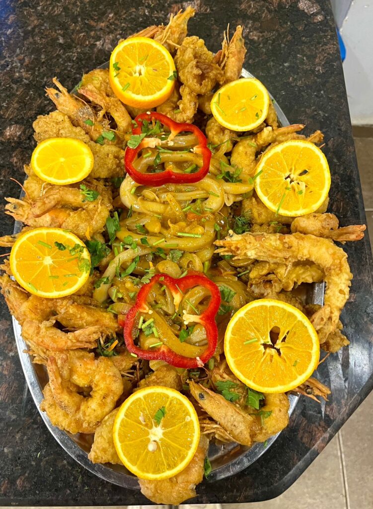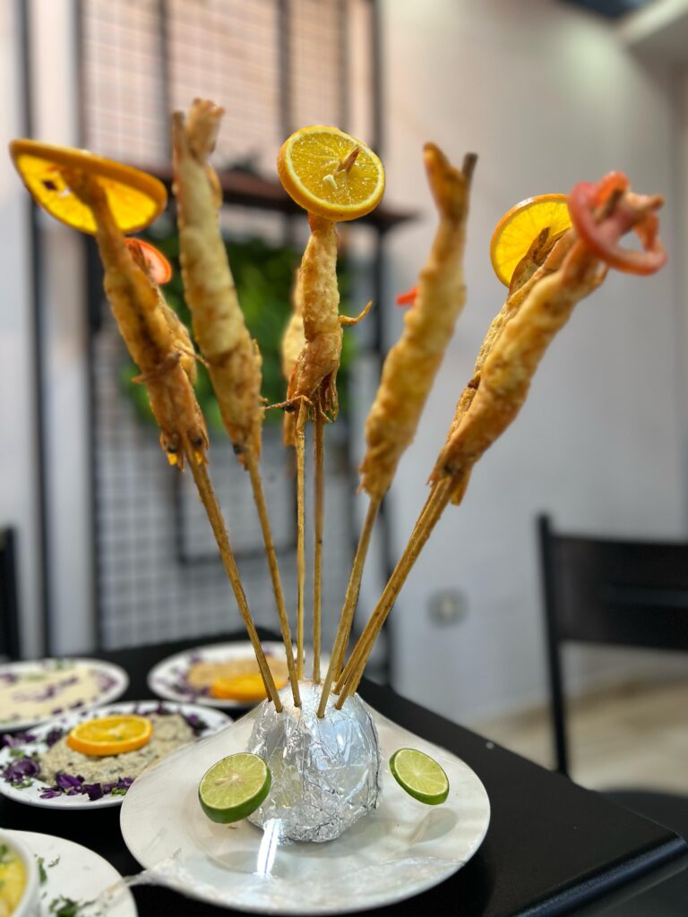 بالإضافة لبعض الاطباق المبتكرة الخاصة بينا زي الكوارع بالجمبرى و كشري السي فود و تورتة الجمبري الحادقة.