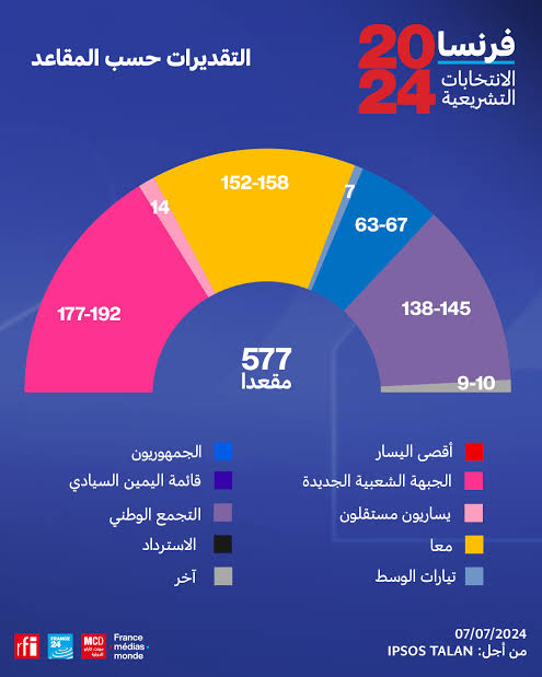 وعلى الرغم من فوز تحالف اليسار بأكبر عدد من المقاعد في الجولة الثانية، إلا أنه كان أقل بأكثر من 100 مقعد من الأغلبية المطلقة، التي تسمح له بتشكيل حكومة منفردا، ووسط نسبة مشاركة في التصويت تقدر بنحو 67%، لم يفز أي فريق بالأغلبية المطلقة البالغة 289 مقعدا، التي تسمح له تشكيل الحكومة منفردا، وبات من المؤكد أن البرلمان الفرنسي سينقسم إلى ثلاث تيارات متنافرة اليسار، والوسط، واليمين المتطرف.