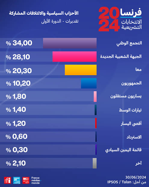 شهد يوم أمس الأحد 7 يوليو 2024, تطور غير متوقع في نتائج الانتخابات الفرنسية الجولة الثانية, حقق ائتلاف تحالفات اليسار تقدما مفاجئا مما جعل حزب لوبان اليميني المتطرف بعيدا بمسافة كبيرة عن السلطة، حيث تراجع حزب التجمع الوطني بزعامة مارين لوبان إلى المركز الثالث بالرغم من الأداء القوي في الجولة الأولى من التصويت.