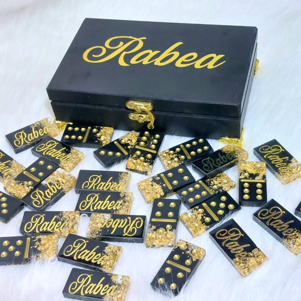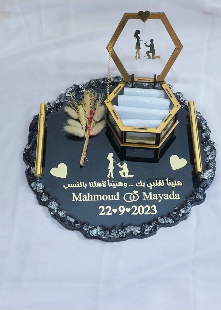 أعرض مجموعة متنوعة من المنتجات تشمل الميداليات، الكوسترات، يافطات المكتب، الساعات، الشيالات، صينية الخطوبة، النوت بوك، الأقلام، توزيعات السبوع، حوامل المصحف، فوانيس رمضان، فواصل الكتب، الدومينو، الشطرنج، البراويز، صواني تقديم للعرايس وبعض قطع جهاز العروسه، وجميع منتجات الريزن الإيبوكسي.