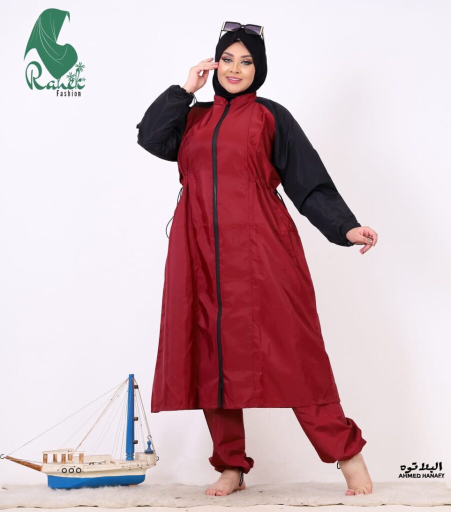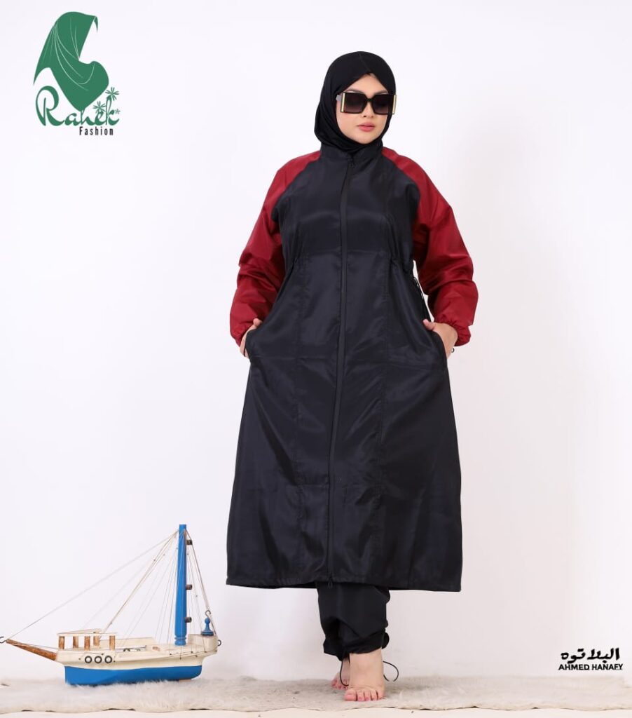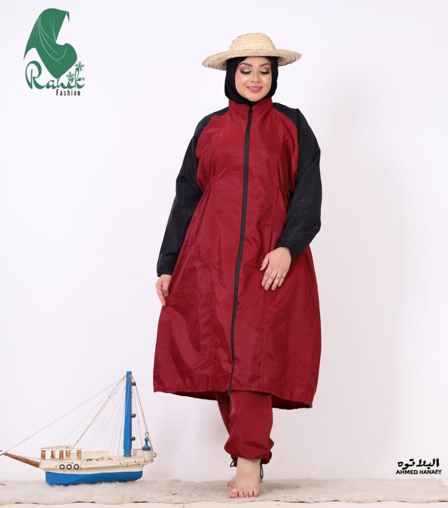 المنتج بتاعي عباره عن مايوه وتر بروف الطارد للمياه مكون من ثلاث قطع تونيك وبنطلون وتلبيسه رأس وكمان في نقاب للمنتقبات متاح منه الوان واطوال مختلفه. الناس حالياً بقى عندها وعي ان هي ما تلبس حاجه ضيقه كمان عندي تلبيس من 55 كيلو ل 150 كيلو مرتاح.
