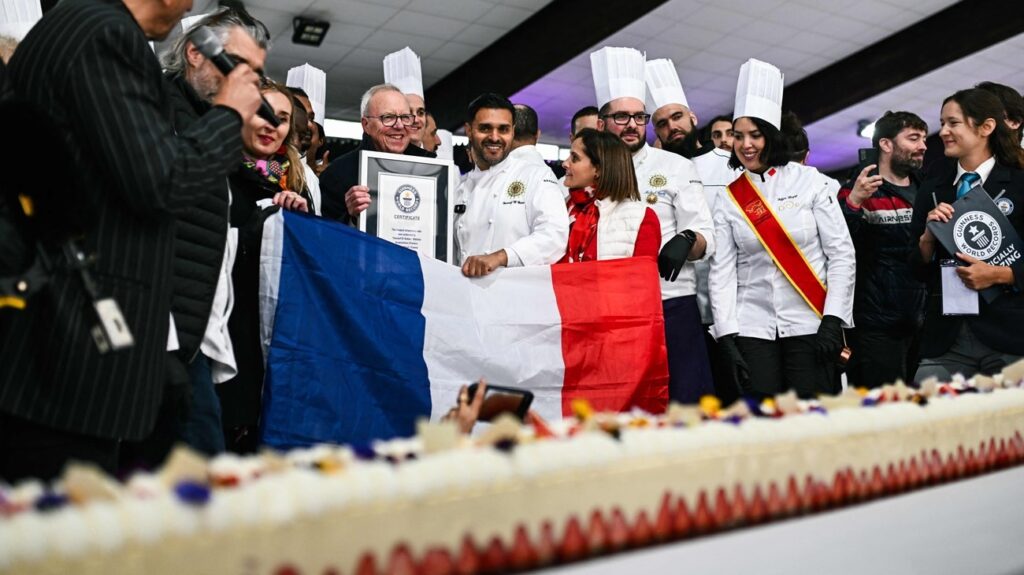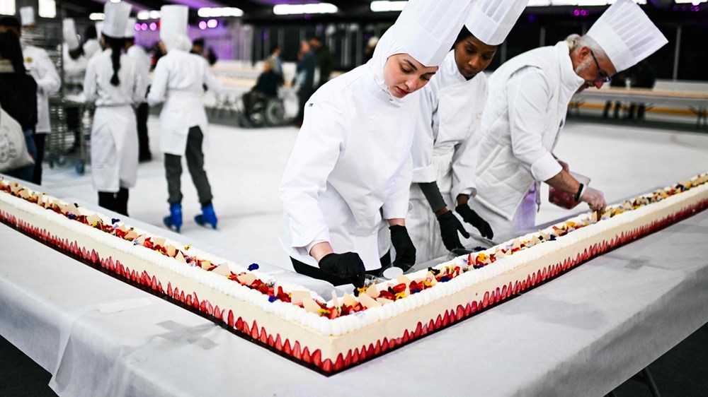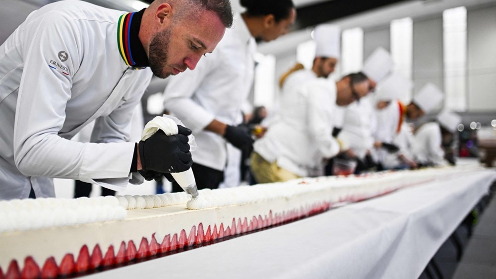 باستخدام 4000 بيضة وشاحنة محملة بالسكر والكريمة، حضّر طهاة فرنسيون متخصصون في الحلويات كعكة بالفراولة تمتد على 121,8 مترا، لتكون الأطول من نوعها في العالم.