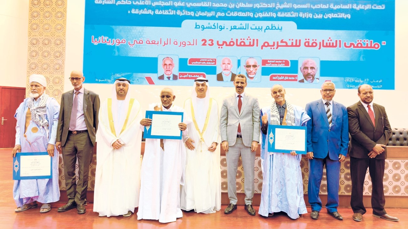 تحت رعاية صاحب السمو الشيخ الدكتور سلطان بن محمد القاسمي، عضو المجلس الأعلى، حاكم الشارقة، شهدت العاصمة الموريتانية نواكشوط احتفاءً رسمياً وثقافياً يرسّخ قيم الوفاء للمبدعين ويكرّس مكانتهم، وذلك ضمن النسخة الثالثة والعشرين من ملتقى الشارقة للتكريم الثقافي الذي نظّمته دائرة الثقافة في الشارقة بالتعاون مع وزارة الثقافة والفنون والاتصال والعلاقات مع البرلمان الموريتانية، حيث تم تكريم أربعة من أعلام الأدب الموريتاني، تقديراً لعطائهم وإسهامهم في إثراء الحياة الثقافية، وهم: الشاعر محمد فال عبداللطيف، والأكاديمي في علم اللسانيات د. يحيى الهاشمي، والباحث اللغوي د. محمدو أمين، والشاعر محمد الحافظ ولد أحمدو.ويأتي الملتقى تنفيذاً لتوجيهات صاحب السمو حاكم الشارقة، بتكريم قامات أدبية أسهمت في خدمة الثقافة العربية المعاصرة، ويحلّ الملتقى للمرة الرابعة في موريتانيا، بعد أن كرّم 12 مبدعاً موريتانياً خلال الدورات السابقة منه.أقيم حفل التكريم في قاعة المؤتمرات في العاصمة نواكشوط، بحضور عبدالله بن محمد العويس، رئيس دائرة الثقافة في الشارقة، ومعالي الحسين ولد مدو، وزير الثقافة والفنون والاتصال والعلاقات مع البرلمان الموريتانية، ومحمد إبراهيم القصير، مدير إدارة الشؤون الثقافية في الدائرة، ووالي ولاية نواكشوط الغربية، ممثلاً عن عمدة بلدية تفرغ زينة.وألقى عبدالله العويس كلمة أشار في بدايتها إلى أهمية امتداد التعاون بين الشارقة وموريتانيا. ولفت إلى أن ملتقى الشارقة للتكريم الثقافي يعود مرّة أخرى إلى الجمهورية الإسلامية الموريتانية ليشهد تكريم كوكبة جديدة من الأدباء والكتاب الموريتانيين، تقديراً وتثميناً لعطاءاتهم الأدبية الثرية.وأضاف العويس، قائلاً: «إن استمرار هذا التعاون الثقافي ليؤكّد على عمق العلاقات الأخوية بين دولة الإمارات العربية المتحدة، والجمهورية الإسلامية الموريتانية، التي ترسّخها القيادة الرشيدة في البلدين».امتنان وتقديررحّب معالي الحسين ولد مدو بالحضور، معرباً عن خالص شكره وامتنانه إلى صاحب السمو حاكم الشارقة. وثمّن وزير الثقافة الموريتاني رعاية سموّه للثقافة، قائلاً: «إننا نثمّن عالياً رعاية حاكم الشارقة الكريمة للثقافة العربية، وللأدب واللغة العربيين، وهي سانحة لنخص ما ناله أدباؤنا وكتابنا الموريتانيون من معاملة استثنائية وتقدير رفيع على يد دائرة الثقافة بإمارة الشارقة، التي ظلت تبذل جهدها من أجل تكريس ثقافة الامتنان والوفاء والتثمين لكل المبدعين».وعبّر المكرمون عن عميق امتنانهم لهذا التكريم الذي اعتبروه وسام فخر واعترافاً بمسيرتهم الثقافية والإبداعية، مشيرين إلى أن مبادرة الشارقة للتكريم الثقافي تُمثل نموذجاً حضارياً في الاحتفاء بالمثقفين العرب.