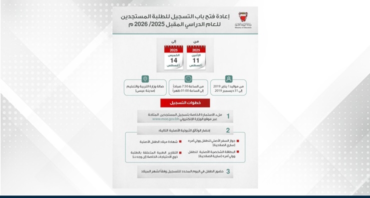 أعلنت وزارة التربية والتعليم عن إعادة فتح باب التسجيل للطلبة المستجدين في الصف الأول الابتدائي للعام الدراسي 2025–2026، وذلك خلال الفترة من يوم الاثنين الموافق 11 أغسطس 2025 وحتى يوم الخميس 14 أغسطس 2025، وذلك يوميًا من الساعة 7:30 صباحًا حتى 1:00 ظهرًا، في صالة وزارة التربية والتعليم بمدينة عيسى. وتدعو الوزارة أولياء الأمور الراغبين في تسجيل أبنائهم من مواليد 1 يناير حتى 31 ديسمبر 2019 إلى زيارة الموقع الإلكتروني للوزارة www.moe.gov.bh للاطلاع على شروط التسجيل، والمستندات المطلوبة، وتحميل استمارة التسجيل. وتؤكد الوزارة على ضرورة إحضار جميع المستندات الثبوتية واستكمال استمارة التسجيل، واصطحاب الطفل خلال الفترات المحددة.