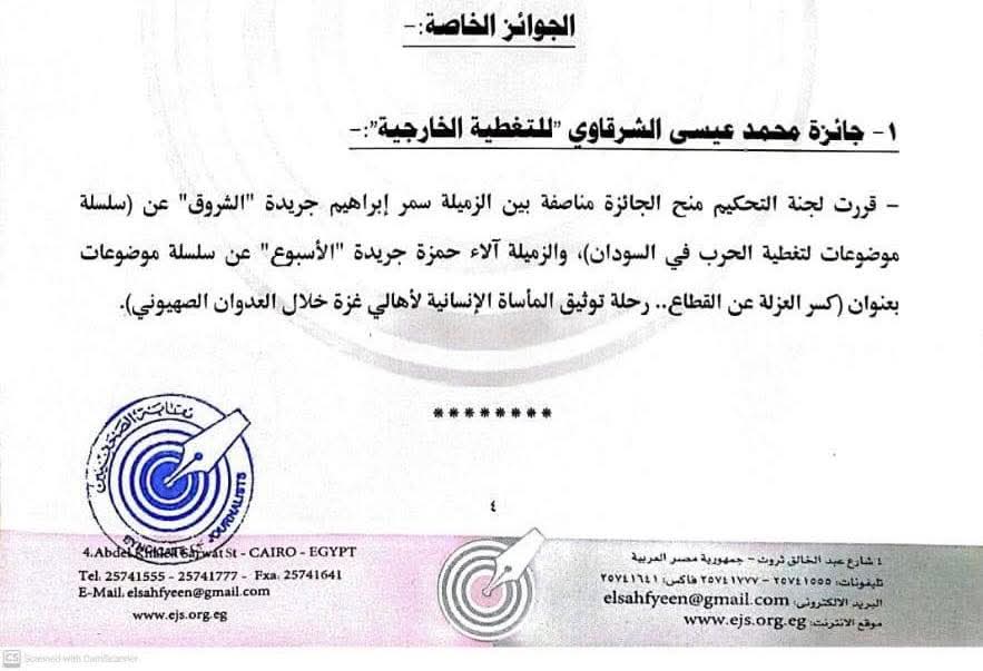 أعلنت نقابة الصحفيين المصريين نتائج جوائز الصحافة المصرية لعام 2025 – دورة الكاتب الكبير محمود عوض، حيث فازت الصحفية سمر إبراهيم من جريدة الشروق بجائزة محمد عيسى الشرقاوي للتغطية الخارجية، وذلك عن سلسلة تغطياتها الصحفية حول الحرب في السودان، والتي نالت تقدير لجنة التحكيم نظراً لعمقها الإنساني ودقتها المهنية.
