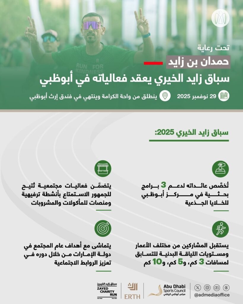 وأكّد سعادة عارف حمد العواني، الأمين العام لمجلس أبوظبي الرياضي، أن سباق زايد الخيري يحظى برعاية كريمة ودعم متواصل من القيادة الرشيدة، ما يعكس التزامها بالرسالة الإنسانية للسباق، وحرصها على ترسيخ مكانة الرياضة كجزء أساسي من حياة المجتمع، وجعلها أسلوباً يُعزّز الصحة والنشاط والسعادة.وقال سعادة العواني: «يمثل السباق صورة حضارية تُجسّد نهج المغفور له الشيخ زايد بن سلطان آل نهيان، طيب الله ثراه، وقيمه في العطاء والعمل الإنساني، ليبقى إرثاً خالداً تتوارثه الأجيال جيلاً بعد جيل».وأضاف سعادته: «تحرص اللجنة المُنظّمة على تخصيص عائدات السباق لدعم مؤسسات وجهات طبية وخيرية، ما يُسهم في علاج المرضى ومساندة المحتاجين، ليعكس السباق مكانته كفعالية رياضية وإنسانية رائدة تجمع بين الرياضة والعمل الخيري في أبهى صورة».وبهذه المناسبة، صرّح البروفيسور يندري فينتورا، الرئيس التنفيذي لمركز أبوظبي للخلايا الجذعية، قائلاً: «يشرفنا أن يساهم سباق زايد الخيري هذا العام بجزء من عوائده لدعم برامجنا الرائدة في مركز أبوظبي للخلايا الجذعية. إن رسالتنا هي قيادة الأبحاث في الطب التحويلي والتجارب السريرية الرائدة على مستوى العالم، مع تقديم رعاية مبتكرة للمرضى مصممة خصيصاً لتلبية احتياجات دولة الإمارات والمنطقة. إن دعم سباق زايد الخيري يعزز التزامنا بأن نكون شريكاً موثوقاً في رعاية الإنسان والارتقاء به، ونشر الوعي حول الابتكارات الطبية، والمساهمة في بناء مستقبل صحي أكثر ابتكاراً محوره الإنسان».ومنذ انطلاقته عام 2001 برؤية صاحب السمو الشيخ محمد بن زايد آل نهيان، رئيس الدولة، حفظه الله، تطوّر سباق زايد الخيري ليُصبح حركة خيرية إنسانية عالمية، تنشر قيم زايد في المجتمعات عبر العالم. فمن أبوظبي إلى نيويورك والقاهرة، وصولاً إلى بكين وريو دي جانيرو وميامي وبودابست، أصبح السباق منصّةً عالمية للوحدة والعطاء والأمل. للمشاركة في السباق، زوروا: