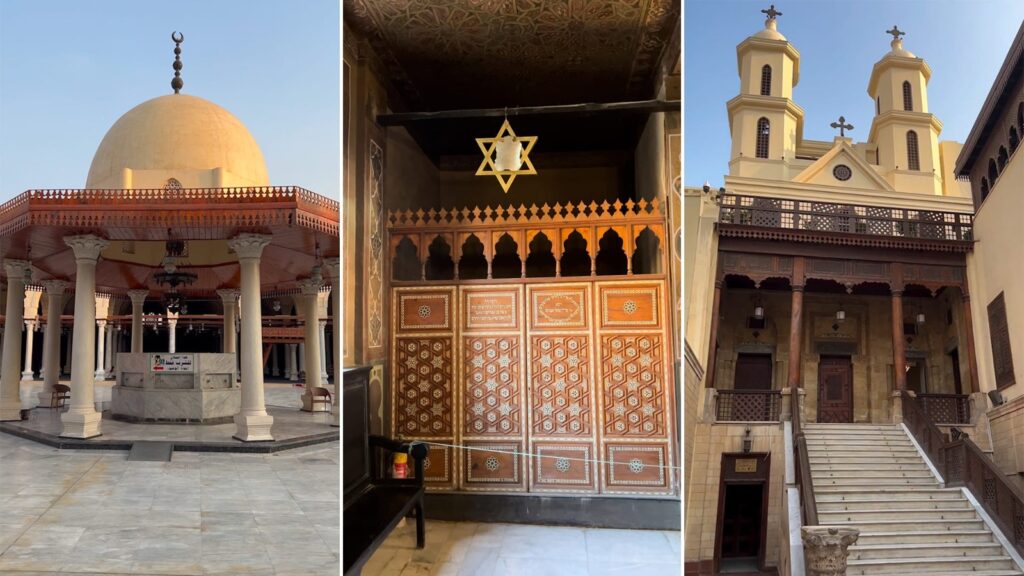 تقع مجمع الأديان في منطقة مصر القديمة، ويعتبر من أهم المواقع التاريخية والدينية في مصر، حيث يجمع المكان بين جامع وكنيسة ومعبد يهودي في مساحة صغيرة جدا وكأنه لوحة حية تجسد فكرة التعايش بين الأديان السماوية الثلاثة عبر العصور، ويرتبط المجمع من الناحية الجغرافية بحصن بابليون الشهير الذي يعود تاريخه إلى العصر الروماني، وهو الحصن الذي احتضن الكثير من الأحداث التاريخية، وكان شاهدا على مرور حضارات متعددة، ومع مرور الوقت تحولت هذه البقعة إلى ملتقى روحاني يجمع بين أديان مختلفة، فصار المسجد بجوار الكنيسة، والمعبد ملاصقا لهما، في مشهد فريد لا يتكرر كثيرا في العالم.أول ما يلفت الانتباه عند الحديث عن مجمع الأديان هو جامع عمرو بن العاص، الذي يعرف بالمسجد العتيق، ويعد أول مسجد بني في مصر وأفريقيا بعد الفتح الإسلامي، على يد القائد عمرو بن العاص في القرن السابع الميلادي، وعلى مر القرون ظل الجامع مركزا دينيا وسياسيا وعلميا، تعرض للتجديد والترميم مرات عديدة لكنه حافظ على مكانته وهيبته