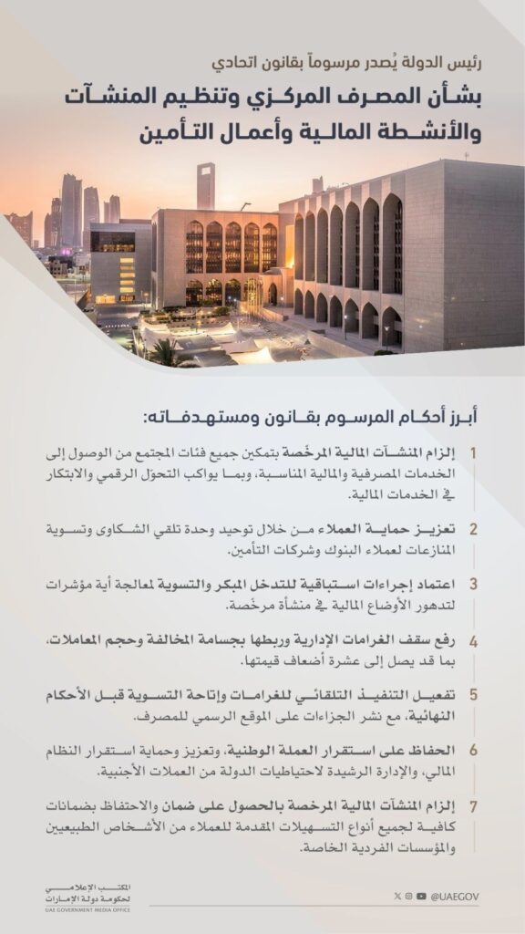 أصدر صاحب السمو الشيخ محمد بن زايد آل نهيان، رئيس الدولة، حفظه الله، المرسوم بقانون اتحادي رقم ( 6) لسنة 2025 بشأن المصرف المركزي وتنظيم المنشآت والأنشطة المالية وأعمال التأمين، في إطار جهود دولة الإمارات المستمرة لتحديث الإطار التشريعي والرقابي للقطاع المالي، وتعزيز استقراره وكفاءته وقدرته التنافسية، وبما يرسخ تواؤم المنظومة الوطنية مع أرقى المعايير الدولية، ويُعزّز استقلالية المصرف المركزي ودوره المحوري في تحقيق الاستقرار المالي والنقدي.ويستهدف المرسوم بقانون الحفاظ على استقرار العملة الوطنية، وتعزيز وحماية استقرار النظام المالي، والإدارة الرشيدة لاحتياطيات الدولة من العملات الأجنبية، كما يحدد المهام الأساسية للمصرف المركزي وفي مقدّمتها وضع وتنفيذ السياسة النقدية، وتنظيم الأنشطة المالية المرخّصة والرقابة عليها وفقاً للمعايير الدولية، وإصدار أنظمة ومعايير لضمان ممارسات مالية نزيهة وفعَّالة، والاحتفاظ باحتياطات أجنبية كافية لتغطية القاعدة النقدية، ودعم التمويل المستدام ودمج مبادئ الحوكمة، ورصد المخاطر النظامية وتحليلها، وتطوير البنية التحتية للأسواق المالية والإشراف عليها.