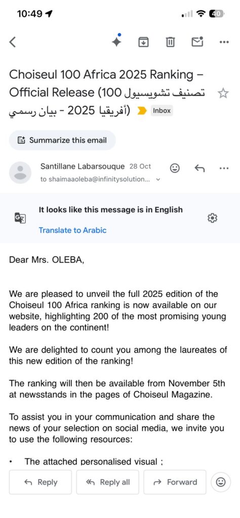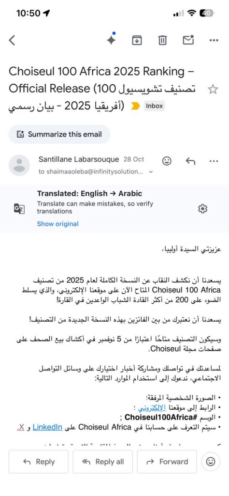 اختيار شيماء عليبة ضمن “Choiseul 100 Africa” لا يُعد إنجازًا شخصيًا فحسب، بل هو تأكيد على المكانة المتنامية لمصر داخل القارة الإفريقية، وعلى الدور المتزايد لشبابها في صياغة مستقبلها الاقتصادي والسياسي.