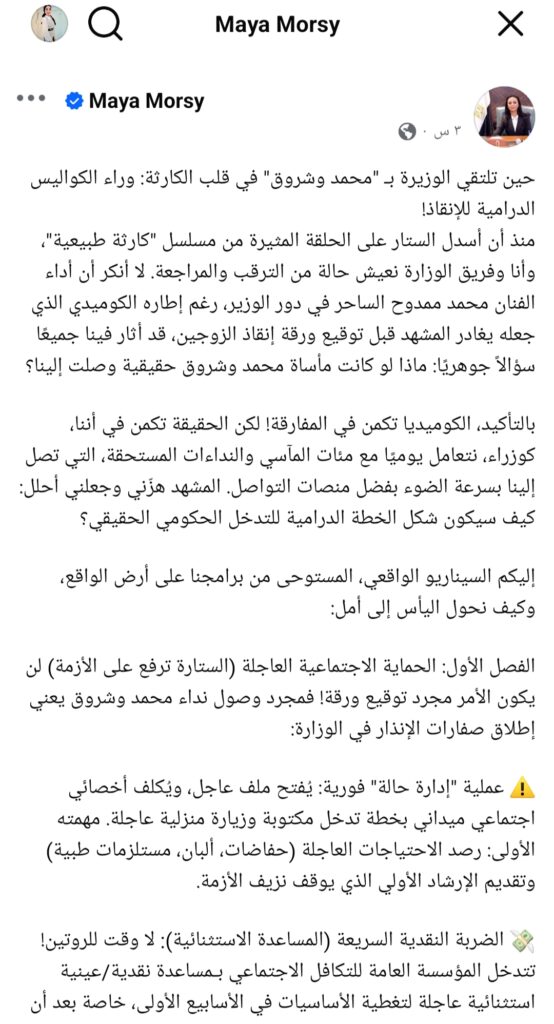 في ردّ سريع ولافت، قدّمت الدكتورة مايا مرسي إشادة استثنائية بصنّاع مسلسل «كارثة طبيعية»، معتبرة أن المشهد الذي جمع بين الفنان محمد ممدوح — مجسّدًا دور الوزير — والزوجين محمد وشروق، تجاوز حدود الدراما ليصنع صدى واقعيًّا يلامس جوهر عمل الوزارات ودوائر الحماية الاجتماعية في لحظات الخطر.