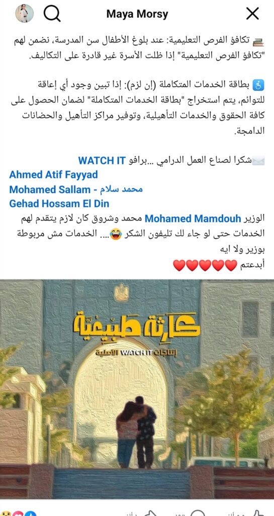 وقد وجّهت تحية تقدير إلى منصة WATCH IT والنجوم:– أحمد عاطف فياض– محمد سلام– جهاد حسام الدين– والفنان محمد ممدوح، الذي قدّم — رغم الطابع الكوميدي — دورًا أعاد النقاش حول المسؤولية الحكومية في زمن الأزمات.