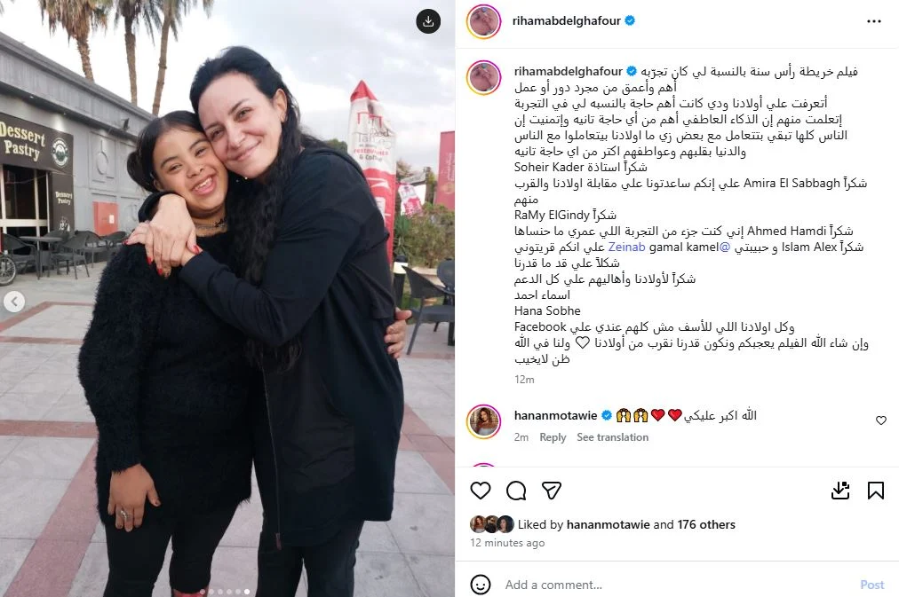 وتابعت:” اتعلمت منهم إن الذكاء العاطفي أهم من أي حاجة تانية وتمنيت إن الناس كلها تبقي بتتعامل مع بعض زي ما أولادنا بيتعاملوا مع الناس والدنيا بقلبهم وعواطفهم اكتر من اي حاجة تانية شكراً لأولادنا وأهاليهم علي كل الدعم وإن شاء الله الفيلم يعجبكم ونكون قدرنا نقرب من أولادنا ولنا في الله ظن لايخيب”.