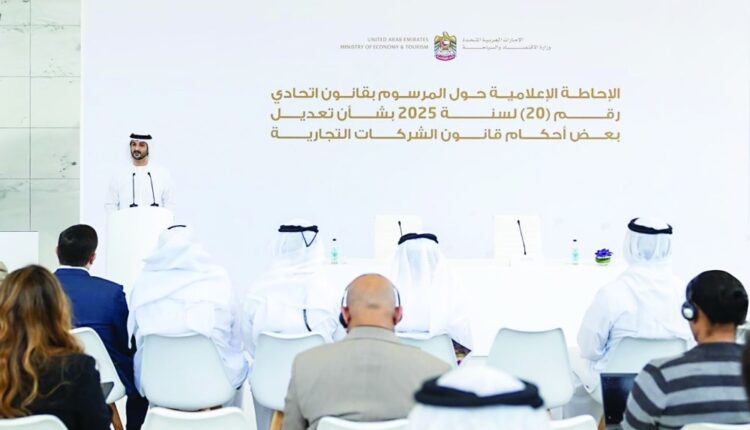 نظّمت وزارة الاقتصاد والسياحة إحاطة إعلامية استعرضت خلالها المرسوم بقانون اتحادي رقم (20) لسنة 2025 بشأن تعديل بعض أحكام المرسوم بقانون اتحادي رقم (32) لسنة 2021 الخاص بالشركات التجارية، والذي أصدرته دولة الإمارات، وتضمّن تعديلات جوهرية واستباقية شملت 15 مادة، إلى جانب استحداث مادة جديدة تُنظّم وتُشرعِن نقل قيد الشركات في السجل التجاري لدى السلطات المختصة.شارك في الإحاطة معالي عبدالله بن طوق المري، وزير الاقتصاد والسياحة، بحضور عبدالله آل صالح، وكيل الوزارة، وممثلين عن هيئة الأوراق المالية والسلع وعدد من الدوائر الاقتصادية المحلية، من أبرزهم وليد العوضي، الرئيس التنفيذي لهيئة الأوراق المالية والسلع، وسيف أحمد السويدي، مدير عام دائرة التنمية الاقتصادية في عجمان، والمستشار بركان خليفة الخليفة، المدير التنفيذي لقطاع حوكمة الأعمال في دائرة التنمية الاقتصادية – أبوظبي.رؤية استشرافيةوأكد معالي عبدالله بن طوق أن دولة الإمارات، وبتوجيهات قيادتها الرشيدة، حرصت على تبنّي رؤية استشرافية طويلة المدى لتنمية بيئة أعمال متقدمة وريادية للشركات بمختلف أحجامها وأشكالها، وفق أفضل الممارسات، حيث عملت الدولة على تطوير تشريعات وسياسات اقتصادية تنافسية، وذلك إيماناً منها بأهمية هذا القطاع الحيوي في دعم نمو الناتج المحلي الإجمالي للاقتصاد الوطني، وكونه شريكاً أساسياً في مسيرة التنمية المستدامة للدولة خلال الخمسين عاماً المقبلة، بما يتماشى مع مستهدفات رؤية «نحن الإمارات 2031» في أن تتبوّأ الدولة المركز الأول عالمياً في تطوير التشريعات الاستباقية للقطاعات الاقتصادية الجديدة بحلول العقد المقبل.وقال معاليه، خلال كلمته، في الإحاطة الإعلامية: «تُمثّل التعديلات الجديدة لقانون الشركات التجارية محطة مفصلية تعكس التزام الدولة بتعزيز مرونة واستدامة الشركات ودعم قدرتها على مواكبة الاتجاهات المستقبلية، حيث يتميز بخطوات تشريعية غير مسبوقة على مستوى الدولة والمنطقة، وتُصبُّ في تنافسية بيئة الأعمال وجذب الاستثمار في الدولة، وتُوفِّر إطاراً قانونياً متكاملاً وواضحاً يدعم نمو الشركات واستدامتها، ويسهّل حصولها على التمويل والاستثمارات، ويُعزّز قدرتها على الاستمرارية والتوسع جغرافياً في المناطق الحرة والمناطق الحرة المالية، مع إتاحة مرونة أكبر في هياكل الملكية وعمليات البيع والتخارج، وتعزيز حوكمة الشركات وحماية حقوق المساهمين، ضمن منظومة اقتصادية وطنية رائدة ومبتكرة، وفق أفضل المعايير والممارسات العالمية».