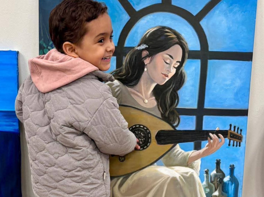 آدم، الذي يُعد أصغر زائر للمعرض، بدا سعيدًا ومندهشًا، يتأمل اللوحة ويقترب منها بحب وبراءة، وكأن الألوان والموسيقى المرسومة تخاطبه بلغته الخاصة. حضوره أضفى على المعرض طابعًا دافئًا، عكس كيف يمكن للفن أن يكون مساحة جذب حتى لأصغر المتلقين.