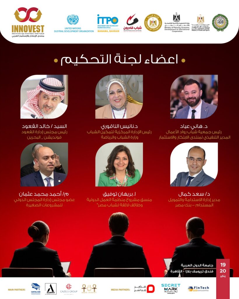 Dr. Nanees El-Nakkouri, Head of the Central Administration for Youth Empowerment at the Ministry of Youth and Sports; Dr. Hany Ayad, Chairman of the Young Entrepreneurs Association and Executive Director of the Arab Innovation and Investment Forum; Dr. Saad Kamal, Director of Sustainability and Sustainable Finance at Banque Misr; Eng. Ahmed Mohamed Osman, Board Member of the International Council for Small Business; Ms. Brehaneh Tawfik, Project Coordinator at the International Labour Organization’s “Decent Jobs for Egypt’s Youth” initiative; and Mr. Khaled Al-Qaoud, Chairman of Al-Qaoud Foundation, Bahrain.