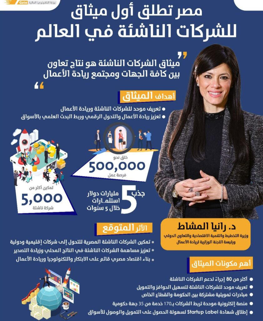 أطلقت مصر في 7 فبراير 2026 أول «ميثاق للشركات الناشئة» في تاريخها، في حدث رسمي كبير ضمن فعاليات قمة “رايز أب”، بحضور الدكتور مصطفى مدبولي رئيس مجلس الوزراء، والدكتورة رانيا المشاط وزيرة التخطيط والتنمية الاقتصادية والتعاون الدولي ورئيسة المجموعة الوزارية لريادة الأعمال وعدد من الوزراء وممثلي مجتمع ريادة الأعمال والمستثمرين وروّاد المؤسسات الصغيرة والمتوسطة.