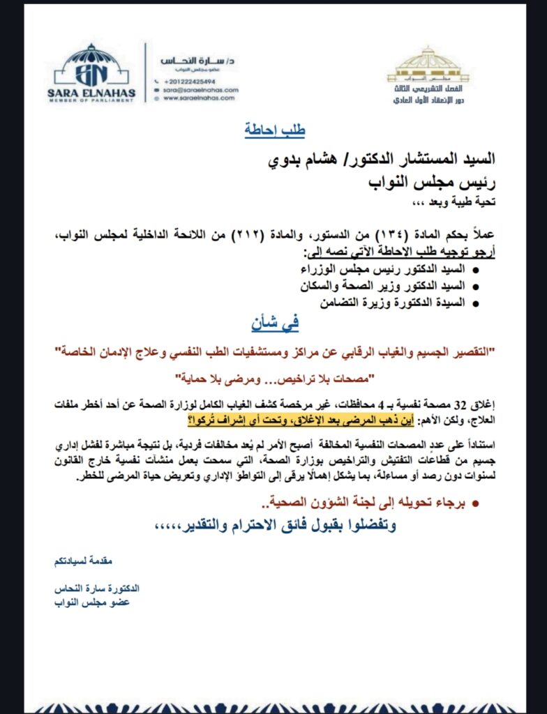 تقدّمت النائبة الدكتورة سارة النحاس بطلب إحاطة بشأن ما وصفته بـ التقصير الجسيم والغياب الرقابي عن مراكز ومستشفيات الطب النفسي وعلاج الإدمان الخاصة، وذلك في أعقاب إغلاق 32 مصحة نفسية غير مرخصة في 4 محافظات.