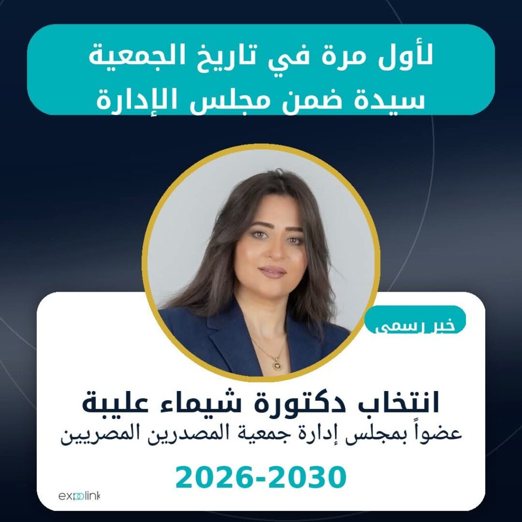 In a landmark step reflecting institutional progress and the advancement of women in economic leadership, Dr. Shaimaa Oleba has been elected as a Member of the Board of Directors of the Egyptian Exporters Association (ExpoLink) for the 2026–2030 term, becoming the first woman to assume this position in the Association’s 29-year history.