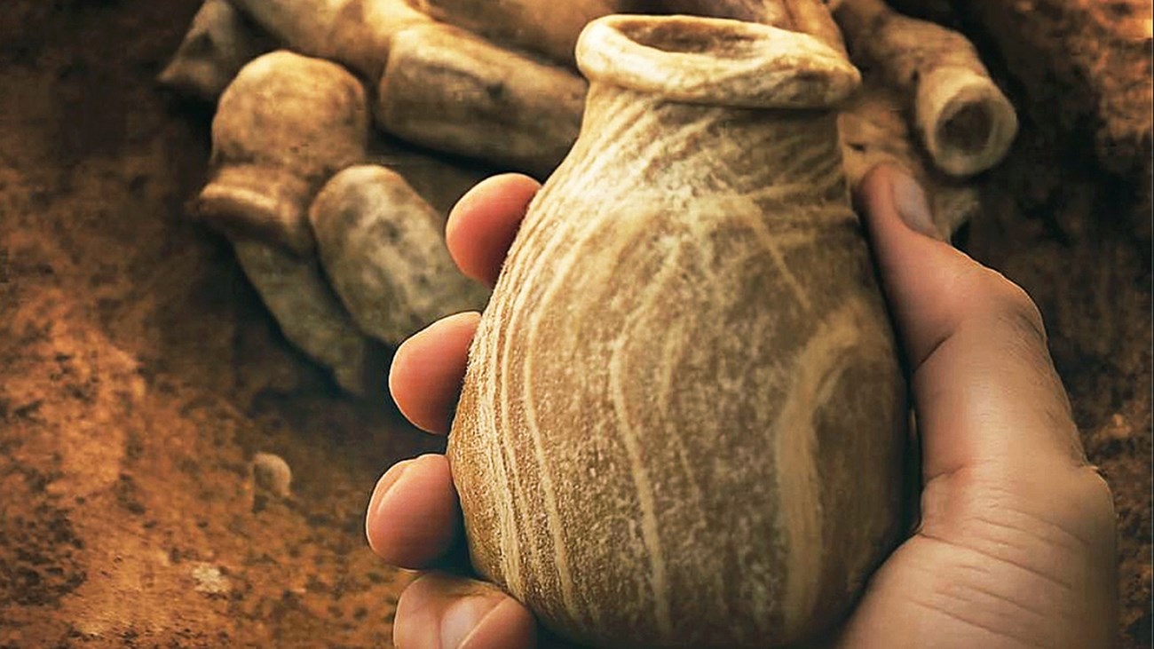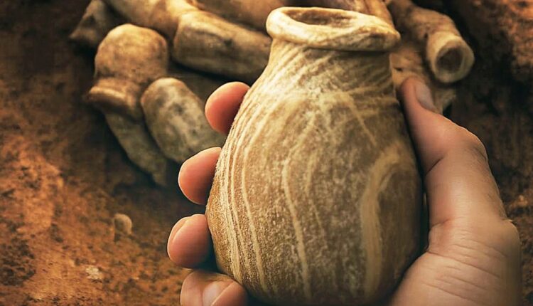 كما كُشف عن أوعية أثقل وزناً وأقل انتظاماً مصنوعة من الحجر المعرّق، يُعتقد أنها تمثل تقليداً محلياً لواردات جاءت من جنوب شرق الجزيرة العربية، ما يعكس تفاعلاً تجارياً وثقافياً واسع النطاق. تخزين العطور وتتميز أوعية المرمر العربية، خاصة تلك التي تعود إلى القرن الأول قبل الميلاد، ببدن أسطواني أو شبه مخروطي، وقاعدة مسطّحة، وعنق قصير تعلوه حافة سميكة تنتهي بشفة ذات مقطع شبه دائري.