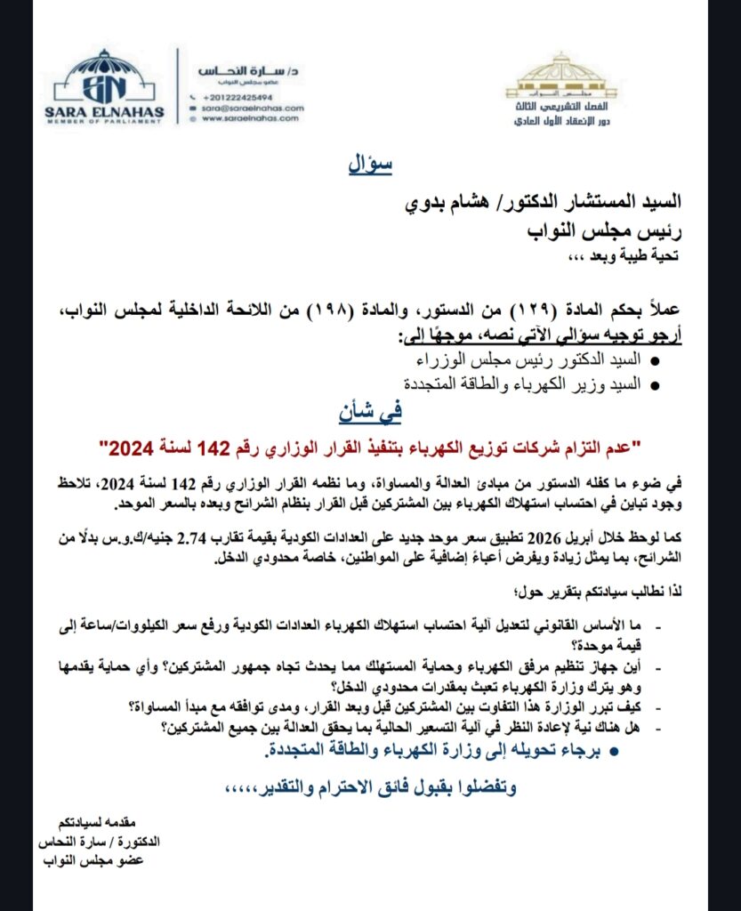 وجّهت النائبة الدكتورة سارة النحاس سؤالًا برلمانيًا إلى كلٍ من السيد الدكتور رئيس مجلس الوزراء والسيد وزير الكهرباء والطاقة المتجددة، بشأن عدم التزام شركات توزيع الكهرباء بتنفيذ أحكام القرار الوزاري رقم 142 لسنة 2024، وما ترتب عليه من تفاوت في احتساب استهلاك الكهرباء بين المواطنين.