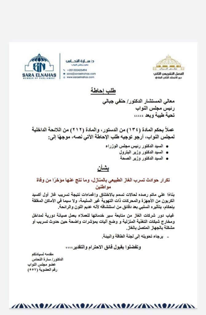 بعد تكرار وقائع تسرّب الغاز الطبيعي داخل المنازل وكثرتها في مصر، أعلنت النائبة الدكتورة سارة النحاس، عضو لجنة الصحة بمجلس النواب المصري، تقدمها بطلب إحاطة موجه إلى كل من رئيس مجلس الوزراء ووزير البترول ووزير الصحة، بشأن تكرار حوادث تسرب الغاز الطبيعي بالمنازل، وما نتج عنها مؤخرًا من وفاة مواطنين.